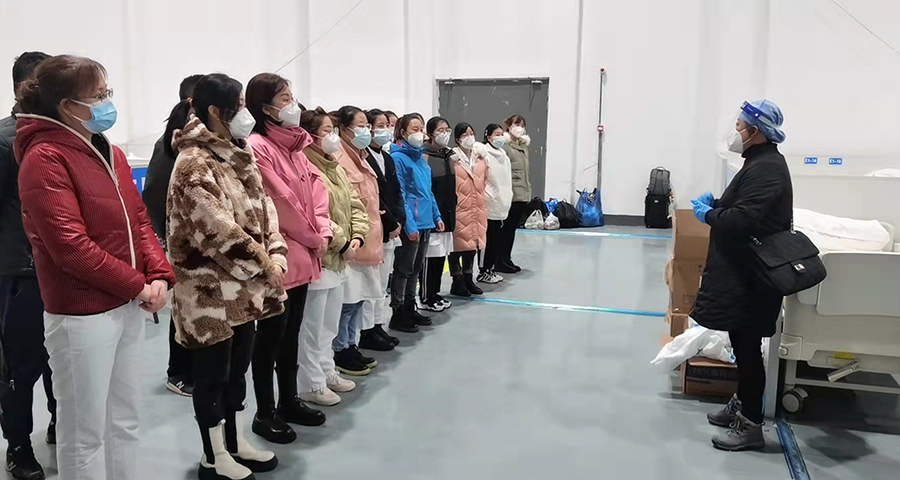 方舱医院内,杨启光副院长在部署工作时指出,在这关键时刻,全体医护人员要咬紧牙关、坚持到底,争分夺秒与时间赛跑、与病毒较量,齐心协力、克难求进。在做好患者救治工作的同时,也要做好自身防护,用行动织密、筑牢疫情“防控网”。