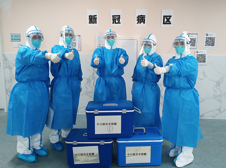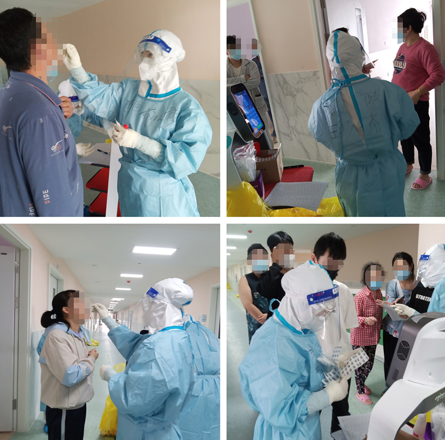 核酸采样队的队员没有固定工作时间,在舱内护理人员不足时,轮休的核酸采样队队员则需进舱配合舱内护士完成其他工作,如隔离宾馆的垃圾清运、环境采样、房间整理打扫等,哪里有需要,就顶到哪里去。“70”后队员主动分享战“疫”经验,像照顾妹妹们一样,时刻嘱咐队员保护好自己;“80”后作为中坚力量,自觉肩负着更多的责任和使命,无论是核酸采样,还是病房分餐,她们主动分担;“90”后积极尝试“新事物”,主动承担起“东软系统APP下载流程”的培训工作,与老师反馈操作中遇到的问题,并积极沟通寻求解决办法。这群“70”“80”“90”人在困难面前毫不畏惧,迎难而上,拼尽全力,无处不彰显着“中医人”的勇敢、自信、坚定与乐观。