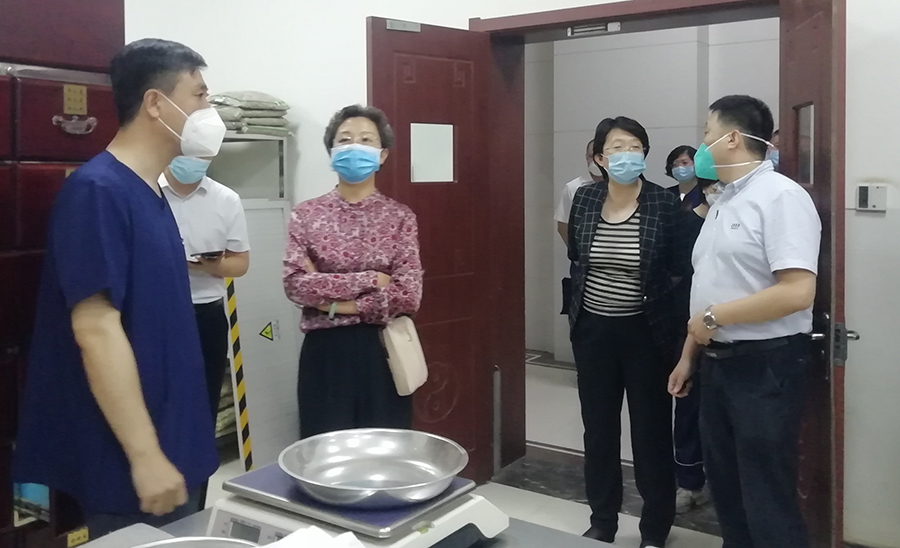 调研一行人对医院多点位进行调研。在急诊大厅,副院长杨启光将医院先进的诊疗设备、煎药设备、煎药操作流程、处方调剂审核制度等一一向王桂敏做了详细介绍。