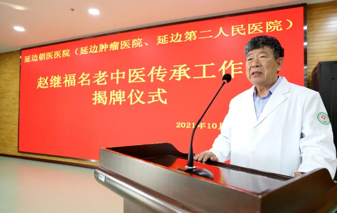 为进一步加强名老中医临床经验和学术思想的传承,推动延边州中医药事业及卫生健康事业的发展,加快延边州中医药人才的培养,金成吉与赵继福教授共同为全国名老中医药专家“赵继福名医传承工作室”揭牌。赵继福教授是当代中医领域具有影响力的领军人物,全国第五批名老中医药专家学术经验继承人指导教师,全国名老中医药专家传承工作室建设项目专家。他临床经验丰富,擅长中医药治疗内科和妇科疾病,尤其善于诊治心脏病、高血压、哮喘、脾胃病、肾病、甲状腺疾病、脉管炎、神经痛、月经病、带下病、更年期综合症及各类皮肤病等。他自行研制的更年饮治疗妇女更年期综合症,曾获中华医学优秀科技成果一等奖。