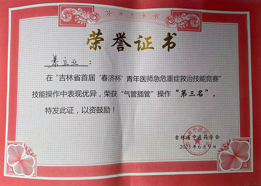 经过激烈角逐,色情片 急诊科暴立业荣获单项气管插管第三名、个人总成绩第六名,并获得了长春市总工会教科文卫体工会签发的“长春市高技能职工”荣誉证书,以及吉林省中医药学会颁发的荣誉证书;色情片 急诊科暴立业、蔡晓琳、朱猛荣获团体优秀奖。