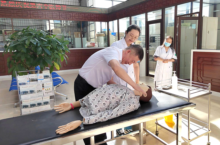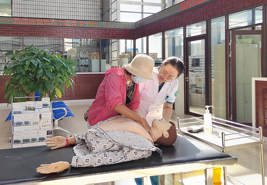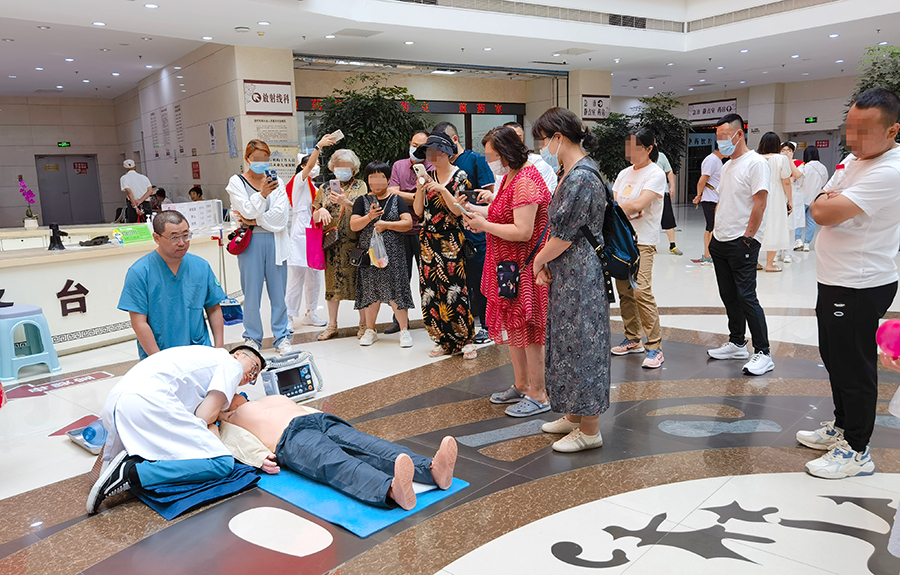 “在开展急救之前,首先要确认现场环境是否安全……”在医院平阳部,副院长钱锐带领急诊医生为现场市民讲解心肺复苏的知识、要领,以及正确的实操流程。专业的操作和细心的讲解,引得现场群众掌声不断,大家积极提问,踊跃参与互动,并在医生的指导下练习胸部按压。