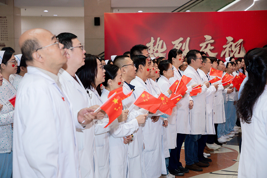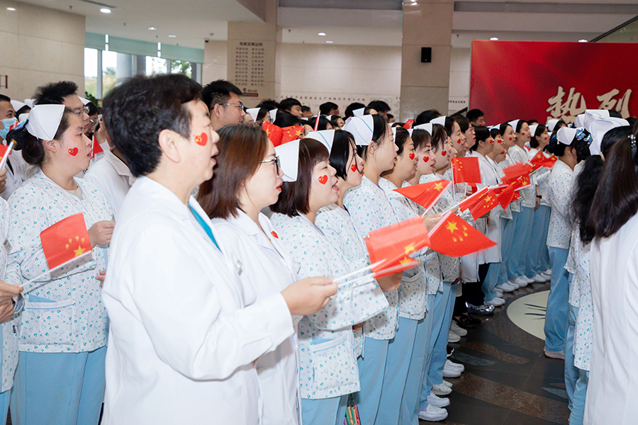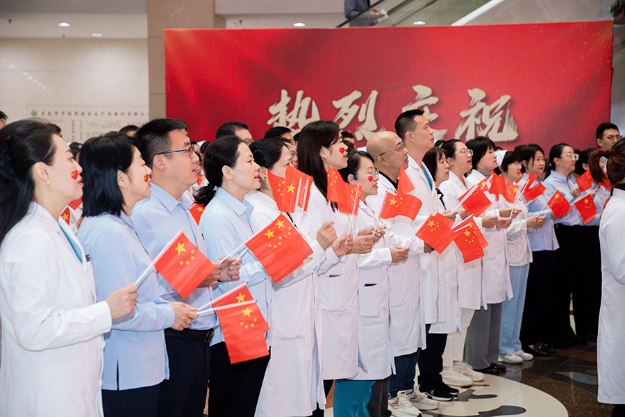 医院党委书记石贵军,院长杨启光,副院长曹亚丽、杨娜、钱锐,纪委书记王妍,以及中层干部和职工代表整齐列队,手持国旗,满怀激情地等待着那激动人心的时刻。