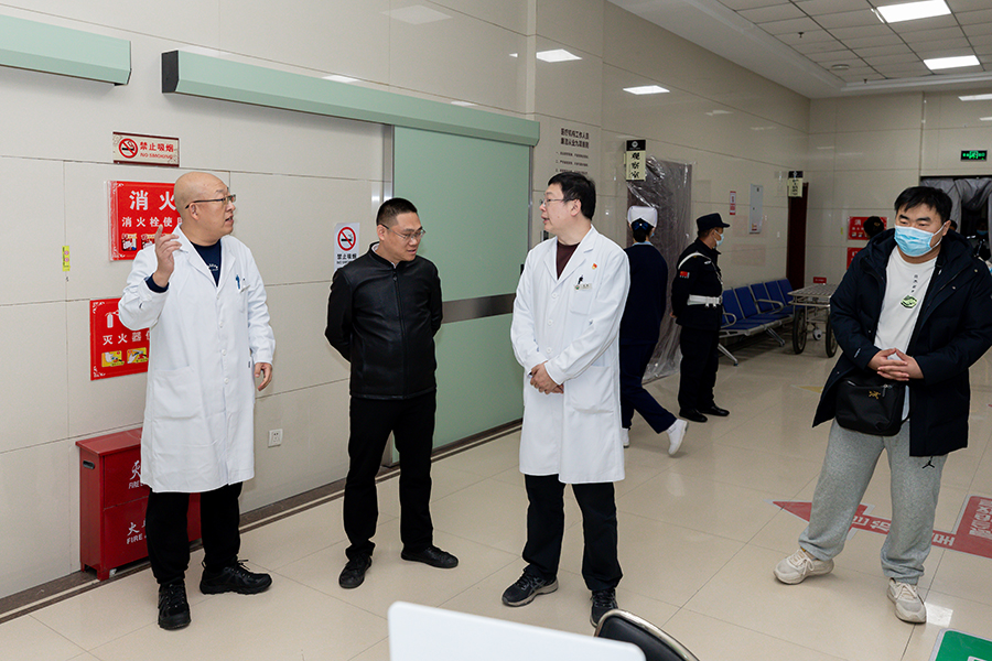 在重症医学科,一行人跟随潘英伟主任的步伐,了解科室的建设布局,就救治细节进行探讨。