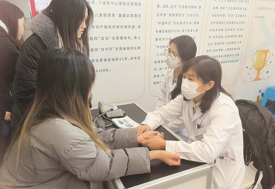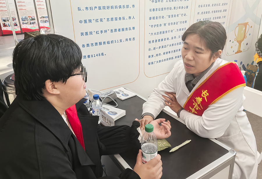 展位上,罗莹副主任和代娜副主任为现场市民把脉问诊。她们耐心倾听市民的病情描述,细致入微地分析病因,并提供专业的医疗咨询和建议。