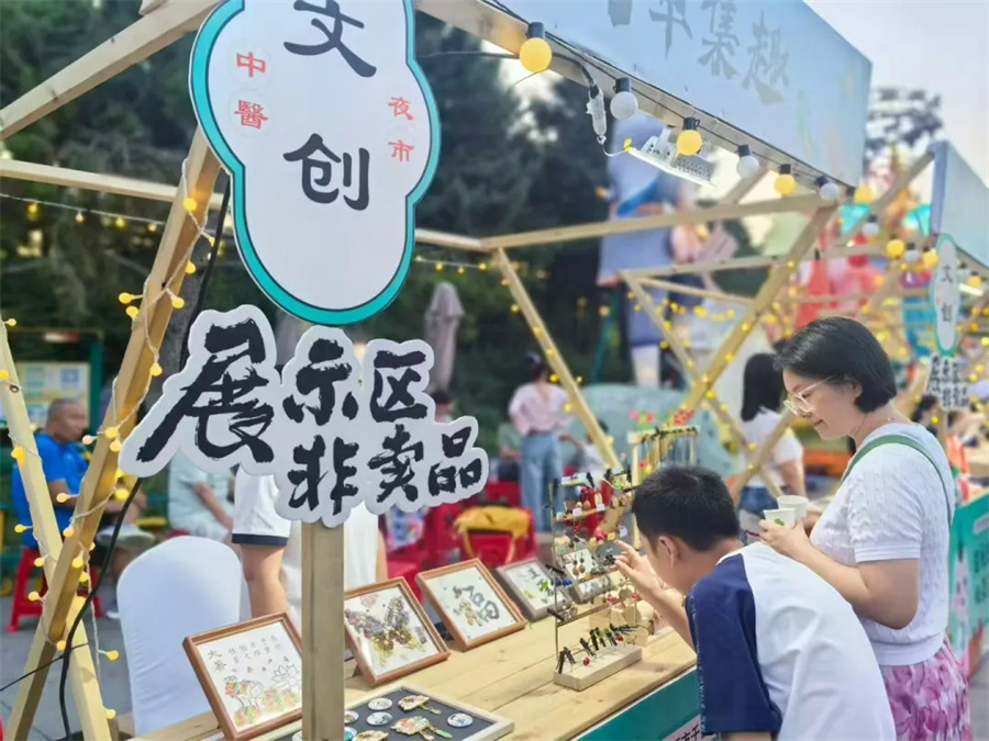 走进公园南门,两行夜市摊位鳞次栉比,往来市民络绎不绝,无不表现出对中医药文化的巨大兴趣。摊位上,各类中医药元素琳琅满目,从吃的到玩的,从中医文创到互动体验,处处散发着独特的文化魅力。