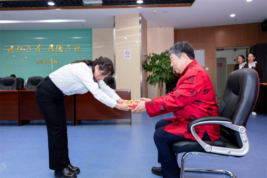 在悠扬的音乐中,弟子双手奉上清香四溢的拜师茶。按照中医传统礼仪,弟子们向赵继福教授敬献“六礼”与鲜花,并行拜师礼,以此表达对恩师的崇高敬意。赵继福教授则回赠弟子们精心准备的葫芦,既取“悬壶济世”之意,又寄托“大医精诚”的殷切期许。
