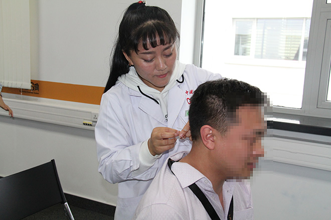 义诊中,有位女士由于长时间坐在电脑前导致自己的颈椎受到严重的损伤,平时还伴有偏头痛,脖子疼等状况,王玲玲医生决定对她施针治疗,并且对她进行了颈椎复位治疗,王玲玲医生表示,这次针灸只会起到缓解作用,一次不能根治颈椎病,要坚持治疗几个疗程,并且要注意自己的坐姿和坚持锻炼身体,这样颈部才会减少损伤。