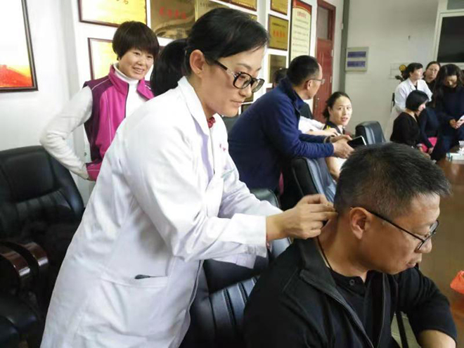 王玲玲、杨春玲医生为患有颈椎病、腰腿痛、视疲劳、头痛、失眠等病症的教师们进行针疗、按摩、手法复位、耳穴调理、运动疗法体验等。王正中医生、张立霞护士为教师们进行健康咨询解答,讲解“防重于治”的治未病养生理念,并针对不同体质发放相应的健康宣教手册。