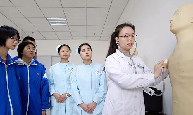 沿着宽敞明亮的走廊往里走,便来到了实训中心的医师护理基地,这里便是中小学生了解中医、学习中医的教学场所。模拟诊室、模拟病房、心肺听触诊实训室、急诊急救实训室、中医综合训练室、图书室、模拟处置室、中医护理技能实训室……在这里,你也可以实现心中的中医梦,了解中医文化,体验中医魅力。