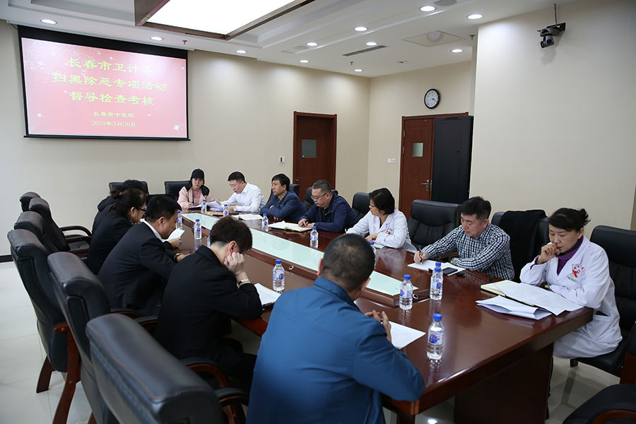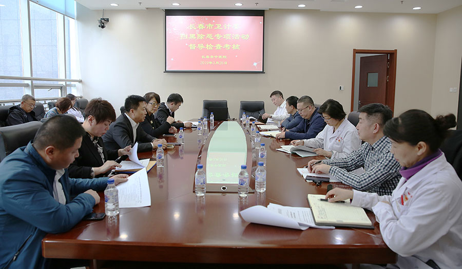 2019年3月26日下午,长春市卫计委副主任罗昕率队一行4人,来到色情片 开展扫黑除恶专项斗争督导检查工作。色情片 党委书记、院长孙良金,党委副书记周艳等医院领导班子成员参加督导检查汇报会。