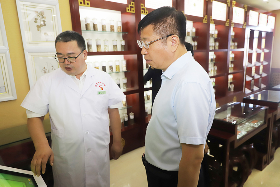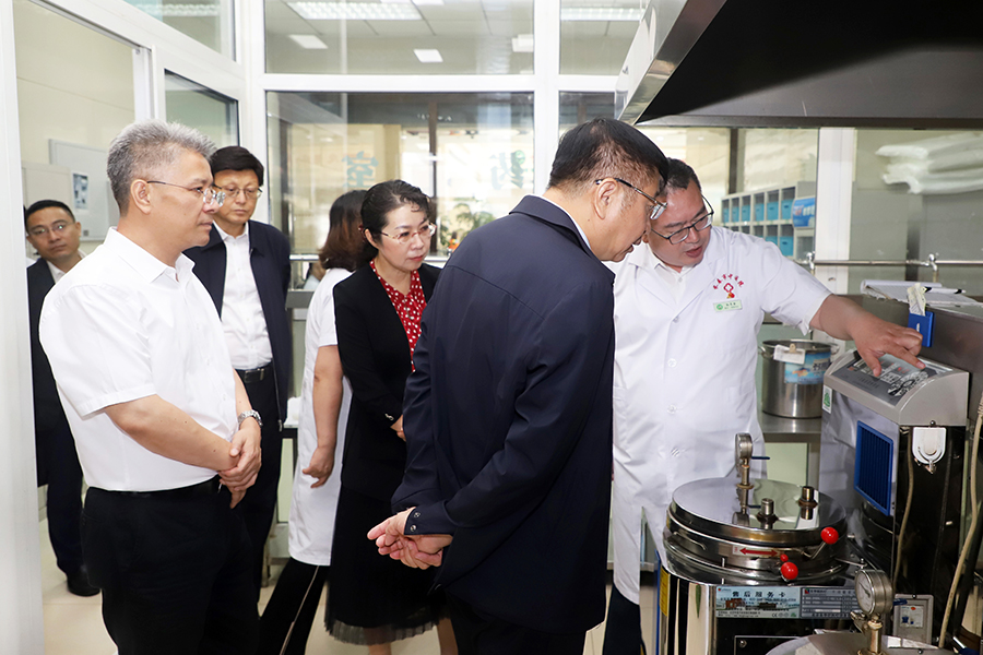 调研一行人先参观了医院的药房、煎药室,在药品展示台前孙良金院长详细介绍了中药的煎制流程,感受中药的制作技艺,当了解到中药自制剂的生产流通情况,对医院坚持采购道地取材的做法给予充分认可。