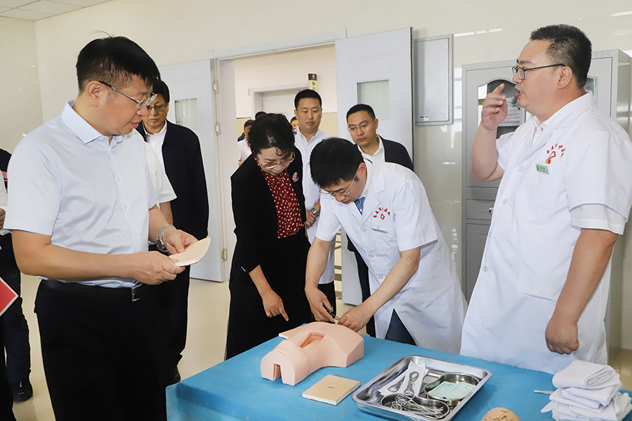 在十三楼实训中心调研一行人分别参观了中药实训室、心肺听诊室、针灸推拿室、护理实训室等地,安立佳副省长亲自带上听诊器在“无线智能化心肺听诊训练与考核系统”上,对模拟人进行“点对点”听诊,单一部位的逼真的心音、呼吸音以及基于病例的多部位听诊训练情况,对医疗人员利用其进行考核的精准度获得高度好评。