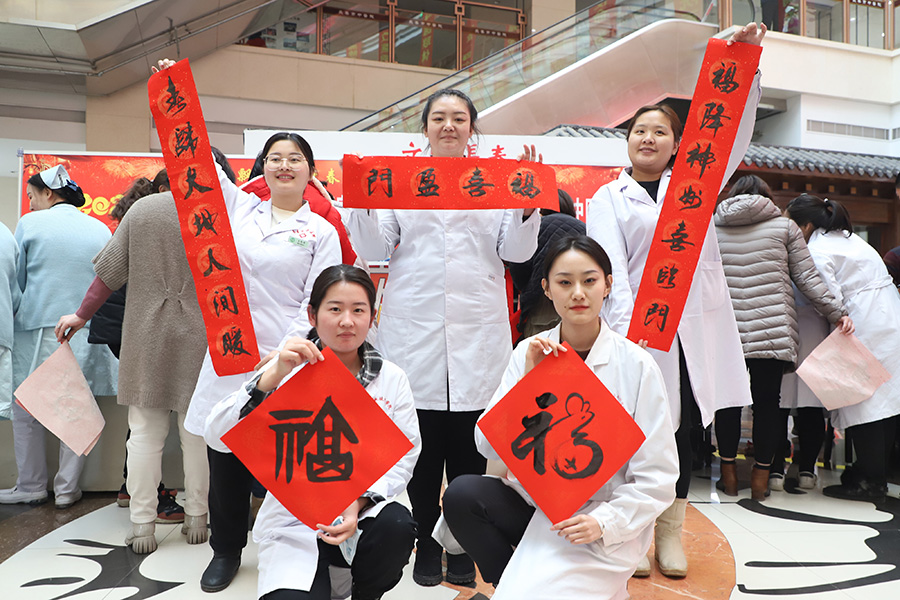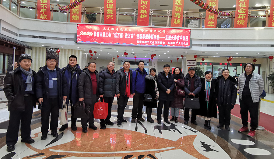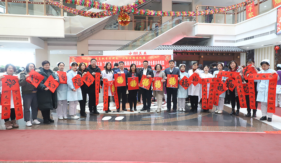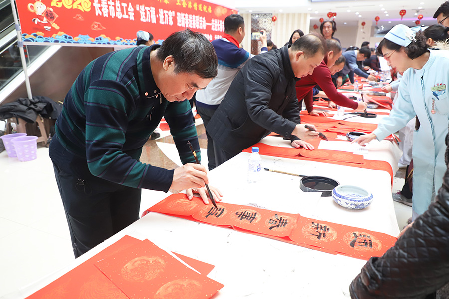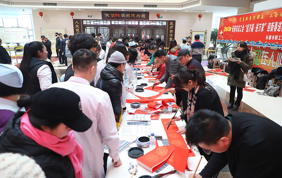 一楼大厅内一派新春喜庆的气氛,由长春市总工会组织的“送万福 进万家”迎新春送春联活动正如火如荼地进行,来自长春市著名的14名书画家现场为医护人员和市民书写对联、福字。