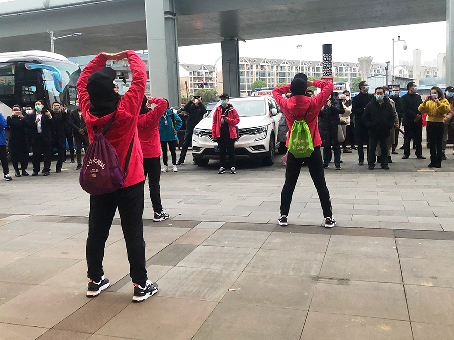 中医文化,博大精深,对康复有着独特的方法。病房里,医生曾带着患者一起做“八段锦”来康复。临行前,再做一次“八段锦”,把强身健体的方法留给武汉人民。