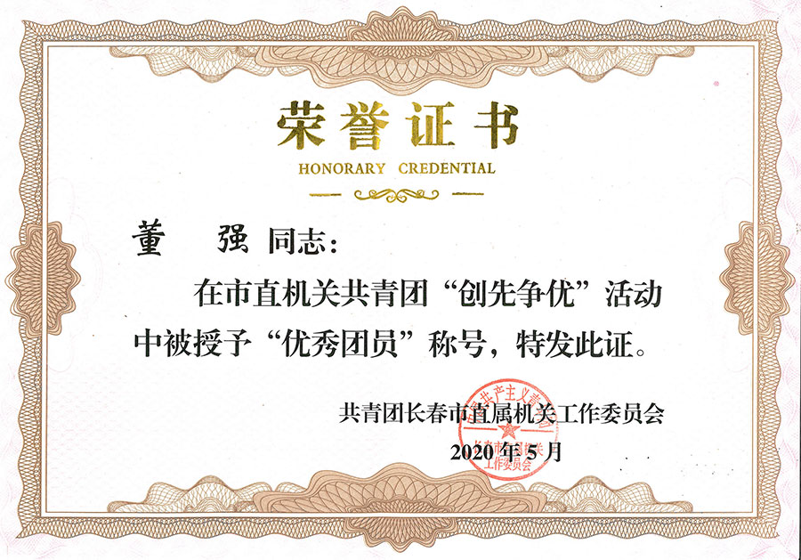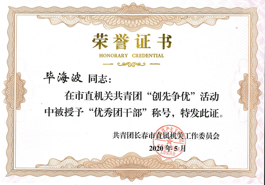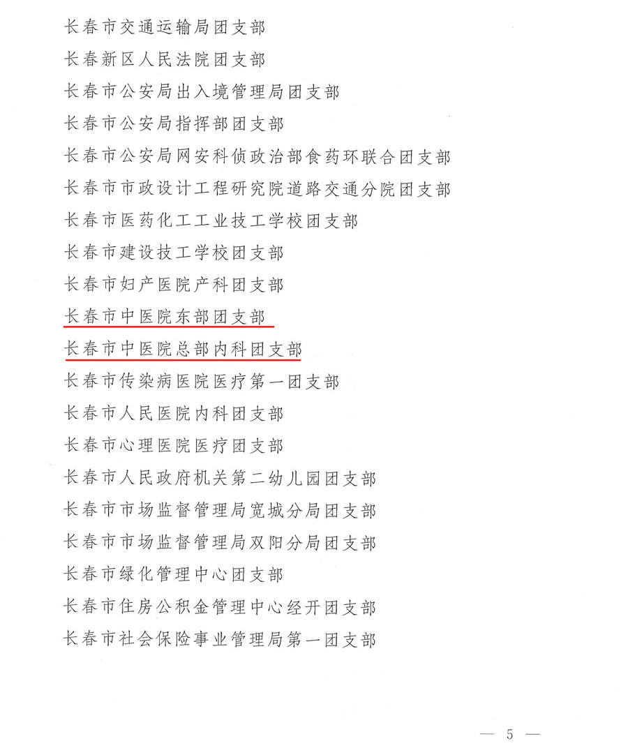 为表扬先进,树立典型,激励广大团员、团干部和各级团组织扎实工作,奋发有为,推动团的工作再上新台阶,共青团长春市直属机关工作委员会决定,对评出的先进团委、团总支、团支部和优秀团员、团干部给予表彰。医院东部团支部、总部内科团支部荣获先进团支部称号,医院团委书记、党委组织员毕海波荣获优秀团干部称号,董强、路宇、付玲玲、姚丽影荣获优秀团员称号。