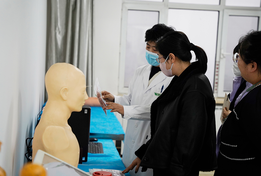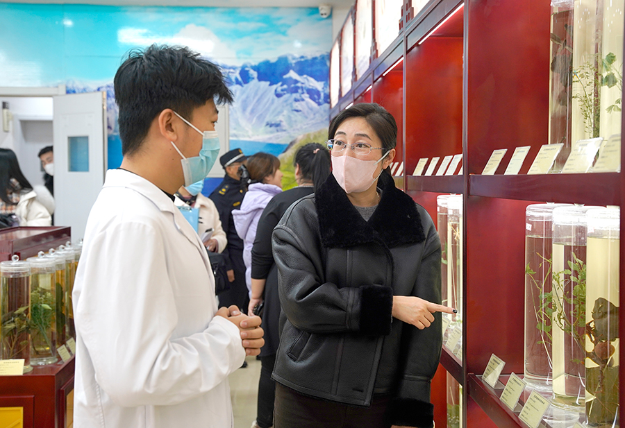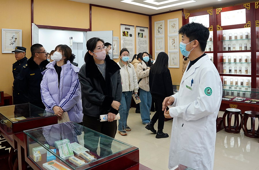 随后,在讲解员的引领下,群英街道的党员们走进中医药文化宣传教育基地,先后参观了中药实训室、外科实训室、针灸推拿实训室,体验中医药文化之美。在中药饮片实训室,魏倩副书记感叹于中医的博大精深,以及中医院实训基地的功能之强大。参观之余,她还饶有兴致地与讲解医生讨论了日常养生的传统中药方。
