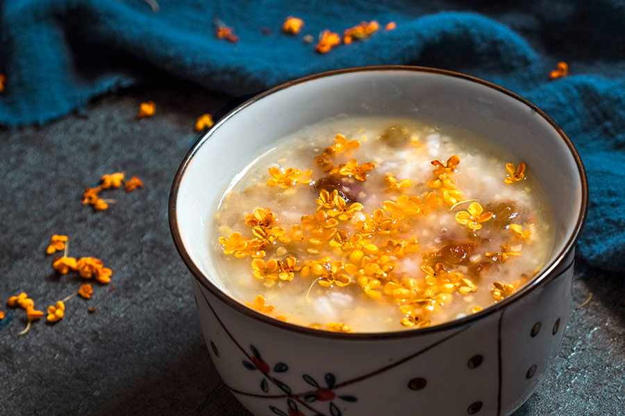 材料:桂花和枸杞各10克,大米100克,白糖15克。