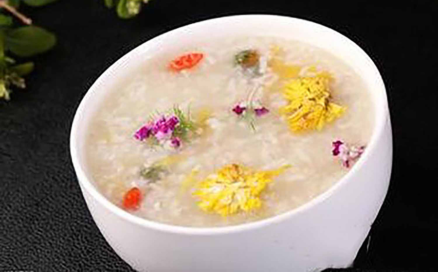 【做法】将枸杞子洗干净备用。把粳米淘洗,放入砂锅中,加适量清水,用小火煮至米粒开花,加入豆豉汁、枸杞子、菊花、精盐、味精、麻油,稍煮后便可食用。食用时可调入红糖。