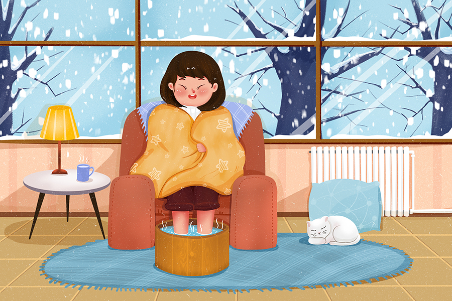 冬天是一年中最需要睡觉的季节,应早睡晚起。早睡以养阳气、晚起以固阴精。最好不要迟于22点休息,不宜起得太早。如果经常熬夜,人的免疫力容易下降,保证充足睡眠,有利于阳气潜藏,阴精蓄积。每晚要休息前,建议大家用热水泡脚来刺激足底穴位,可以加入一些温中散寒的药物泡脚,如艾叶、生姜、红花、益母草等来泡脚,水温37℃-42℃,水没过脚踝,一般15-20分钟即可,一周2-3次。这样可以起到温经通络、散寒止痛的作用,促进下肢血液循环,能有效提高机体抗寒能力,帮助驱寒。