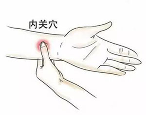 在手掌面关节横纹的中央,往上约三指宽的中央凹陷处。内关穴是临床上用来宽胸止呕、补血强心的重要穴位,堪称人体自带的救心丸。
