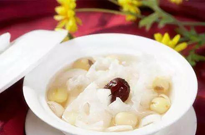 【做法】将银耳洗净,用冷水浸泡去根,撕成小朵,白果用热水烫过切成两半,上述材料文火熬煮成粥,即成。