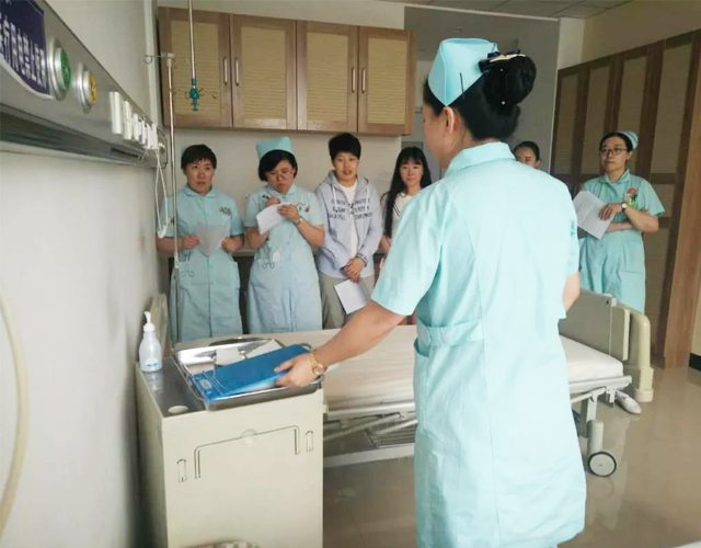 下午2点,科内护士已全部到位,有工作的同事轮流观看练习,护士吴晗每一步都细致地讲解。