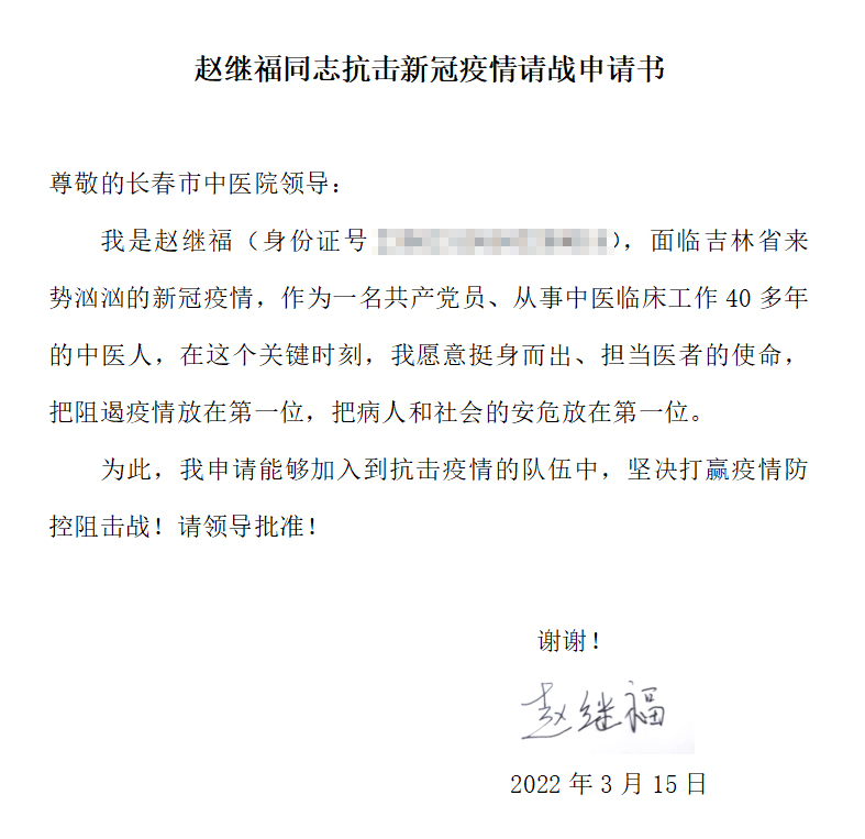 当前,吉林省疫情形势依然严峻复杂,正处于最吃劲的关键阶段。作为抗疫的主力军,全省各地的医务工作者们纷纷提申请,递志愿,都要到抗疫一线去!就连67岁的老党员、全国名中医、色情片 赵继福教授也写了“请战书”。 他在“请战申请书”中写道:“面临吉林省来势汹汹的新冠疫情,作为一名共产党员、从事中医临床工作40多年的中医人,在这个关键时刻,我愿意挺身而出、担当医者的使命,把阻遏疫情放在第一位,把病人和社会的安危放在第一位。为此,我申请能够加入到抗击疫情的队伍中,坚决打赢疫情防控阻击战!”