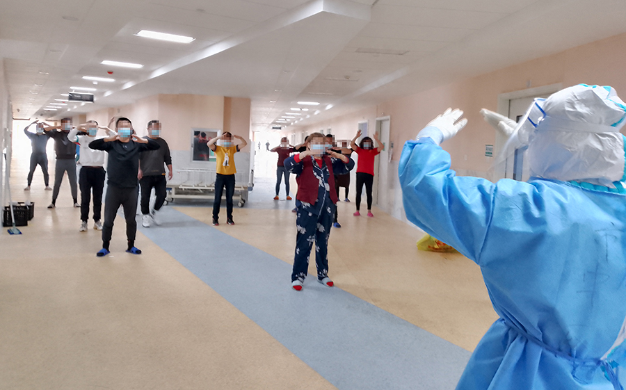作为一名中医人,她们深知中医疗法对恢复患者健康的重要作用。因此,她们便在工作之余组织疗区患者进行八段锦练习。她们一招一式地指导患者,但因为身穿防护服,一整套操下来已经汗流浃背,但她们看到加入的患者越来越多、精气神也越来越好,就觉得自己的付出是值得的!