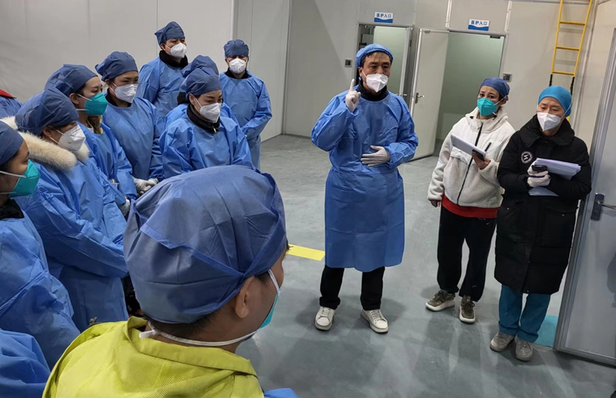 方舱医院内,杨启光副院长在部署工作时指出,在这关键时刻,全体医护人员要咬紧牙关、坚持到底,争分夺秒与时间赛跑、与病毒较量,齐心协力、克难求进。在做好患者救治工作的同时,也要做好自身防护,用行动织密、筑牢疫情“防控网”。