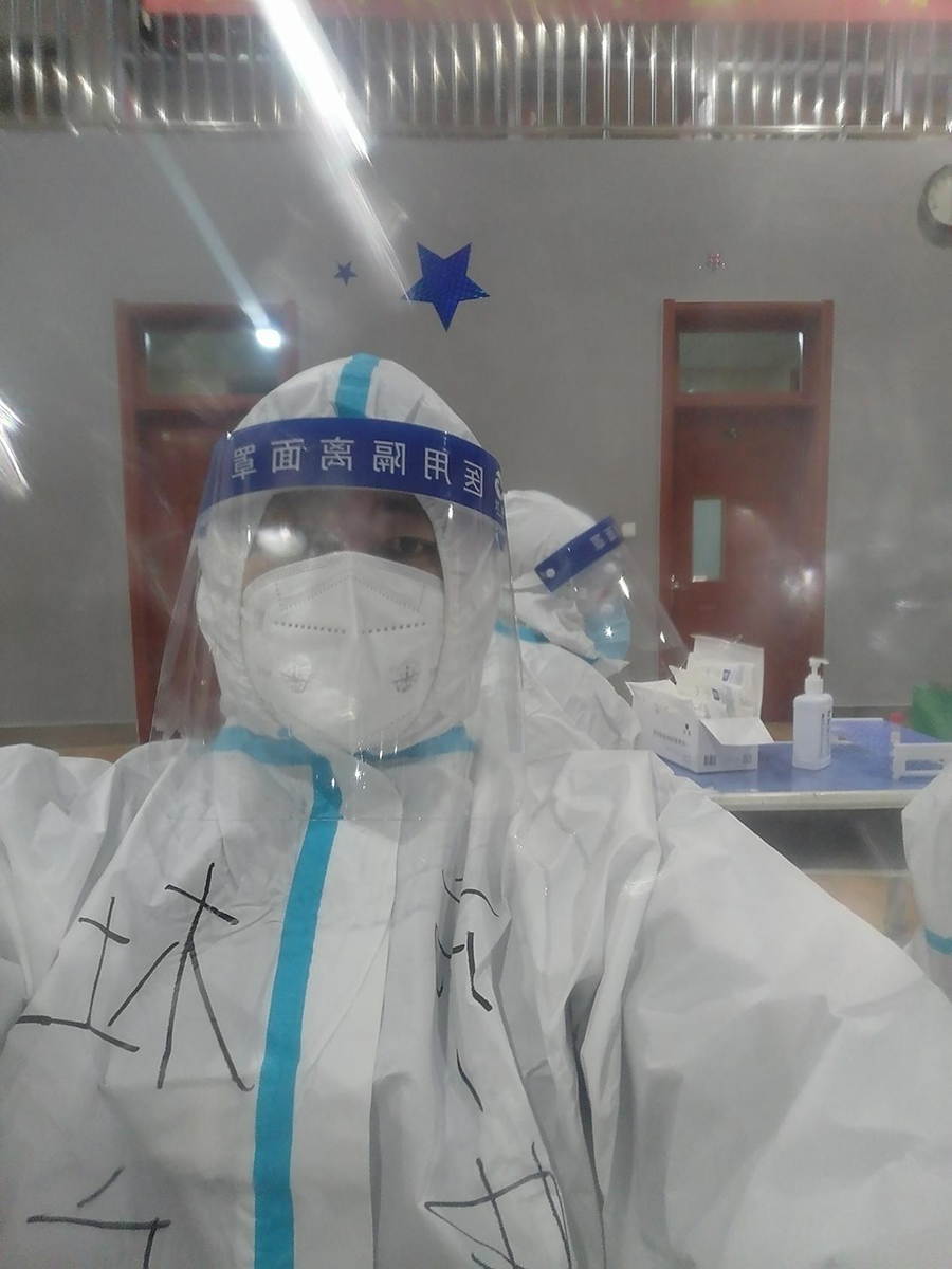 科里了解他的同事都知道,杜庆是一个严重过敏体质的人,而且还患有严重的高血压,平时需要规律服用降压药。但是,他坚持带病抗疫,一往无前。由于执行采样任务时间紧,任务重,身着防护服,不能随时去卫生间,所以他平时基本不喝水,即使早餐发的牛奶也只能看着,不敢喝,降压药(利尿)更是不敢吃,执行完一天任务后,身体也是处于虚脱状态,血压更是经常飙升到180mmhg。然而就是这样,他依然和战友们一样坚守在抗疫一线,只为早日驱散疫情的阴霾,让人们可以自由地沐浴阳光。