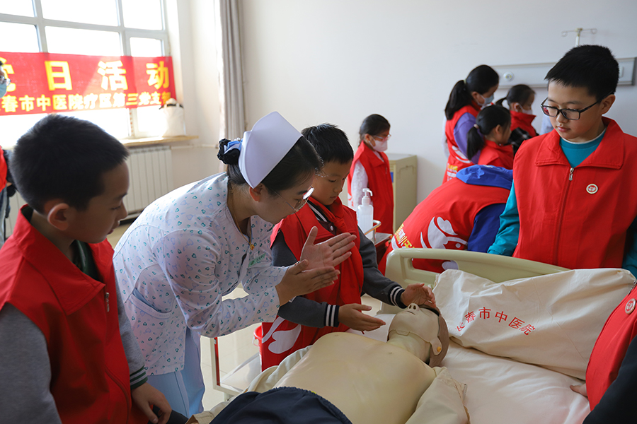 在中医护理实训室,讲解员用通俗易懂的语言,为孩子们生动详细地讲解并演示了海姆立克急救法、骨折或皮外伤的简单包扎处理、心肺复苏术。孩子们认真聆听,并积极参与到实际操作过程中。医护人员对孩子们操作的每一个动作都进行了认真细致的指导、点评,使孩子们对急救突发事件的处理流程有了基本的认识。