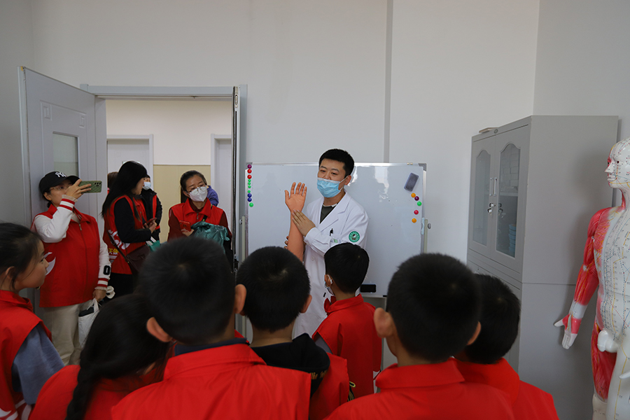 随后,孩子们在讲解员的带领下,来到了中医针推实训室,了解了神秘的人体经络、学习了简单的中医治病防病理念,见识了中医传统的针灸、诊脉等项目。在心肺听诊实训室,讲解员教每位同学使用听诊器听心音和肺音,教大家摸脉搏、数脉搏,让大家了解人体脉搏的正常值。