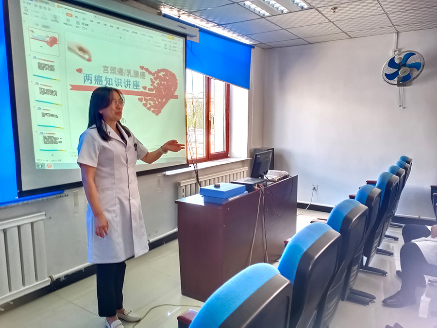 在通榆县中医院,贲越主任、王金平副主任两位专家分别走进骨科、妇科疗区开展查房,重点会诊疑难症状患者,对科室医生进行技术指导,共同开展病例分析等,以达到共同促进、共同提升的目标,发挥医联体帮扶优势。在专家科普知识讲座环节中,贲越主任为大家讲解了《中医特色疗法新进展》,结合专科特色,围绕中医药特色疗法的优势和前景这一主题,重点强调了中医药在治疗骨伤疾病中发挥的积极作用。随后,王金平副主任以《宫颈癌和乳腺癌的防治》为主题,为大家进行了健康宣教。她重点从“宫颈癌的自检和医院普查项目”“如何预防宫颈癌”等方面,对大家进行了“两癌”的健康宣教与知识科普。