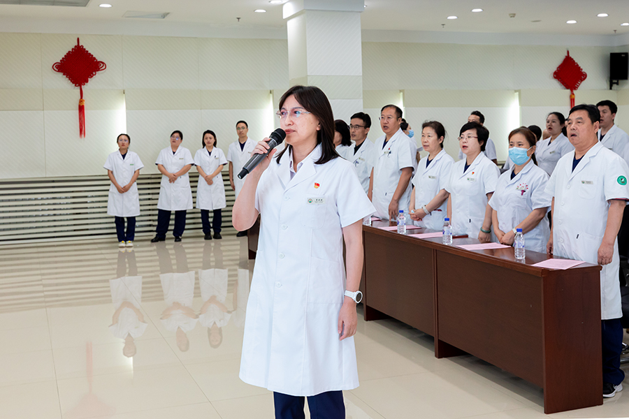 随后,曹亚丽副院长引领全体医师,共同宣读了《大医精诚》中的经典篇章,其声铿锵有力,字字渗透着医者仁心,句句彰显着救死扶伤的崇高誓言。“凡大医治病,必当安神定志,无欲无求,先发大慈恻隐之心,誓愿普救含灵之苦……如此可为苍生大医,反此则是含灵巨贼。”铮铮誓言激励着大家,在守护生命的道路上勇往直前,为百姓健康筑起坚不可摧的铜墙铁壁。