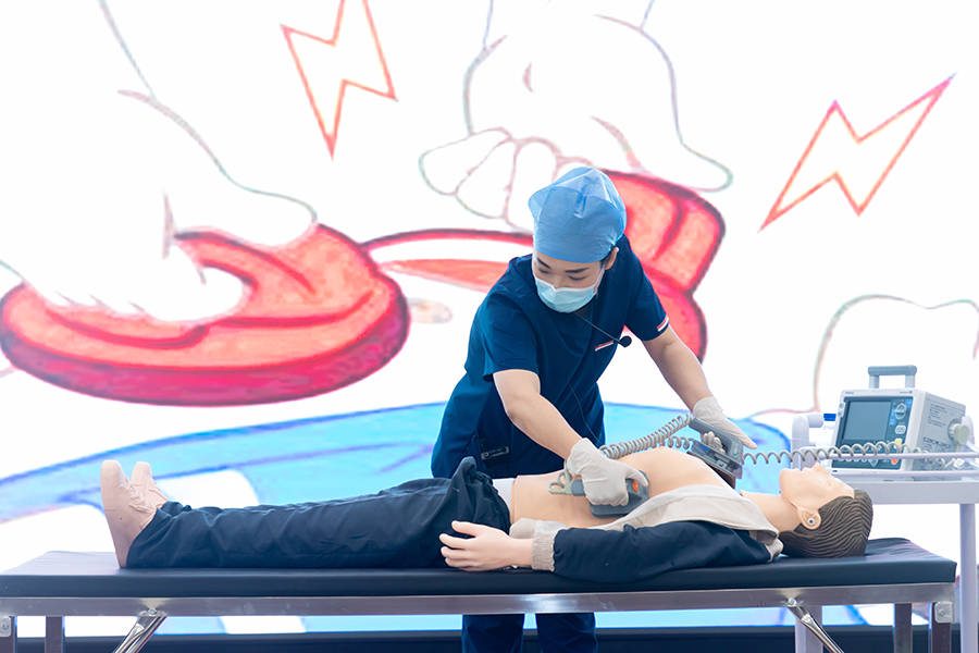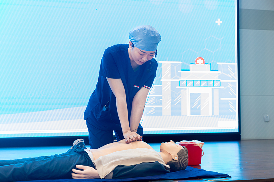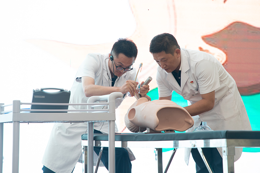 ▲马田田、韩婧、暴立业等急救精英演绎心肺复苏、电除颤、气管插管,展现生命守护的精湛技艺