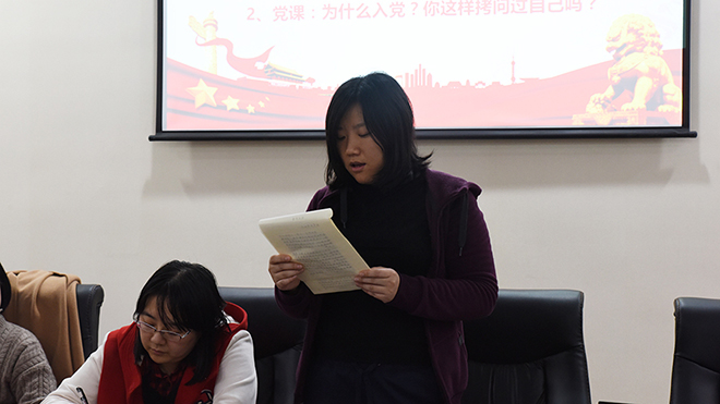 会上,预备党员刘洋同志宣读了个人转正申请,向全体党员汇报自己的思想、生活、工作等情况。按照程序,入党介绍人和支部委员分别汇报和介绍了对刘洋同志的考察情况,提出了同意转正的意见。