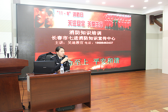 会上,长春市七进消防知识宣传中心的吴迪教官做专题消防安全知识讲座。吴教官用现场互动及结合真实火灾案例的方法,详细讲述了生活中如何安全用电、火灾的应急处理、火灾逃生自救的方法、楼层起火的逃生方法、灭火器的使用方法、天然气管道起火的处置方法、公交车起火逃生方法、遇暴雨驾驶员打不开车窗的处置方法等安全知识,营造了“人人知消防,人人会消防,人人爱消防”的安全意识氛围。