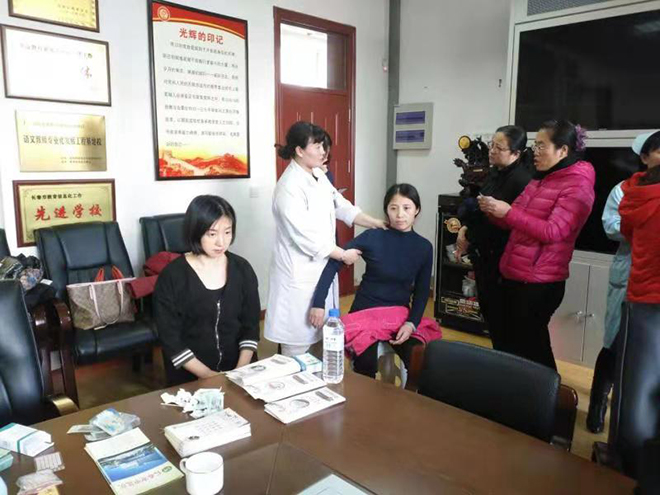 王玲玲、杨春玲医生为患有颈椎病、腰腿痛、视疲劳、头痛、失眠等病症的教师们进行针疗、按摩、手法复位、耳穴调理、运动疗法体验等。王正中医生、张立霞护士为教师们进行健康咨询解答,讲解“防重于治”的治未病养生理念,并针对不同体质发放相应的健康宣教手册。