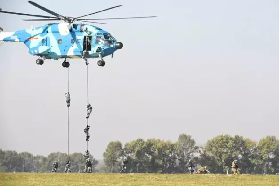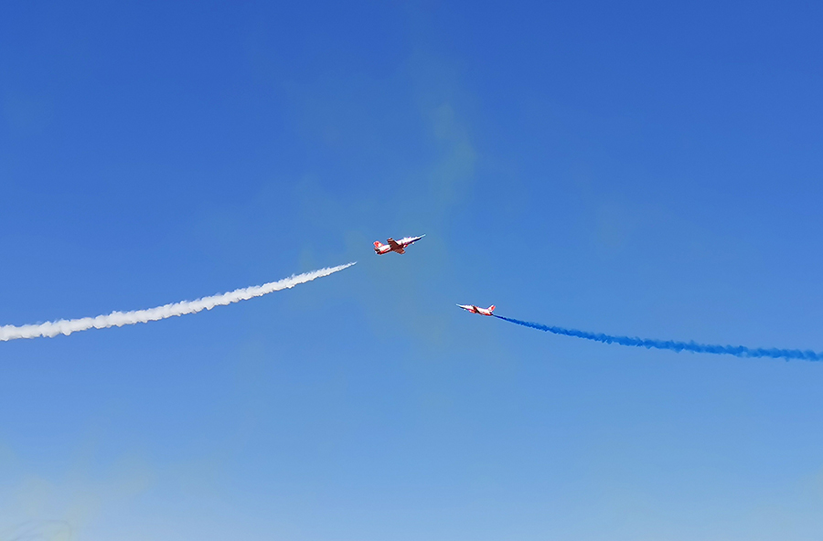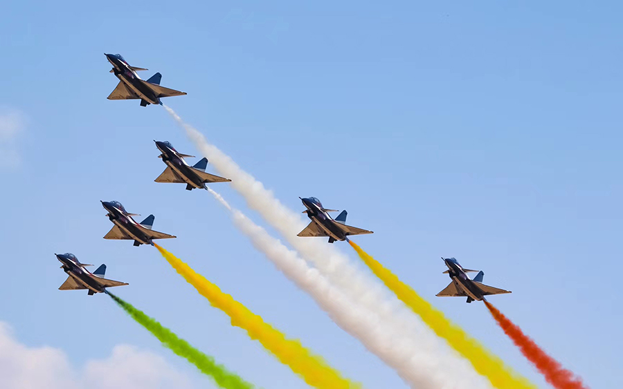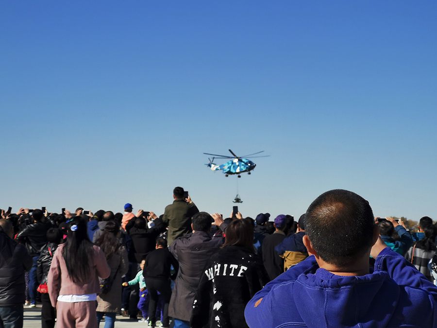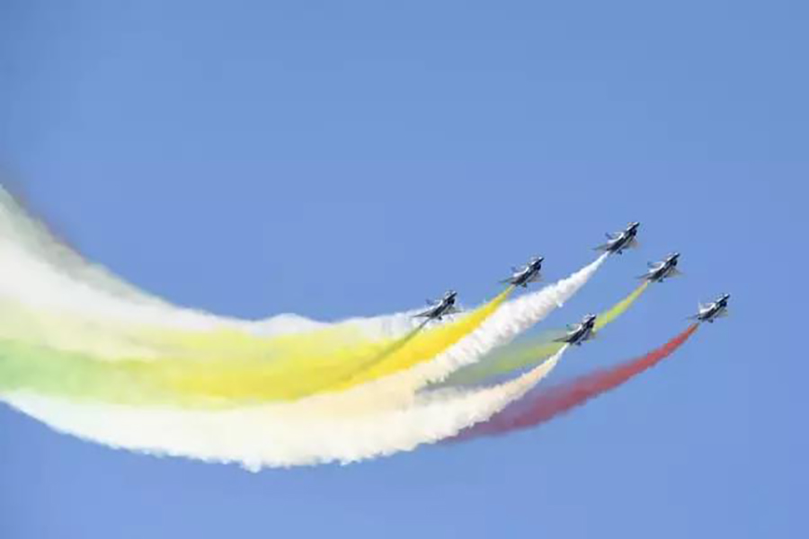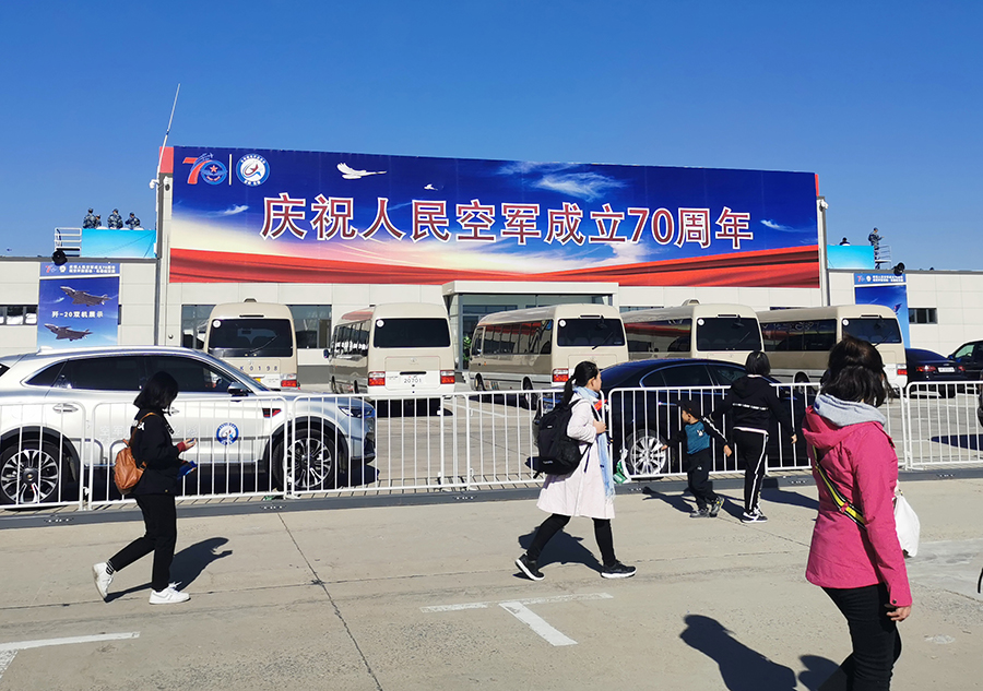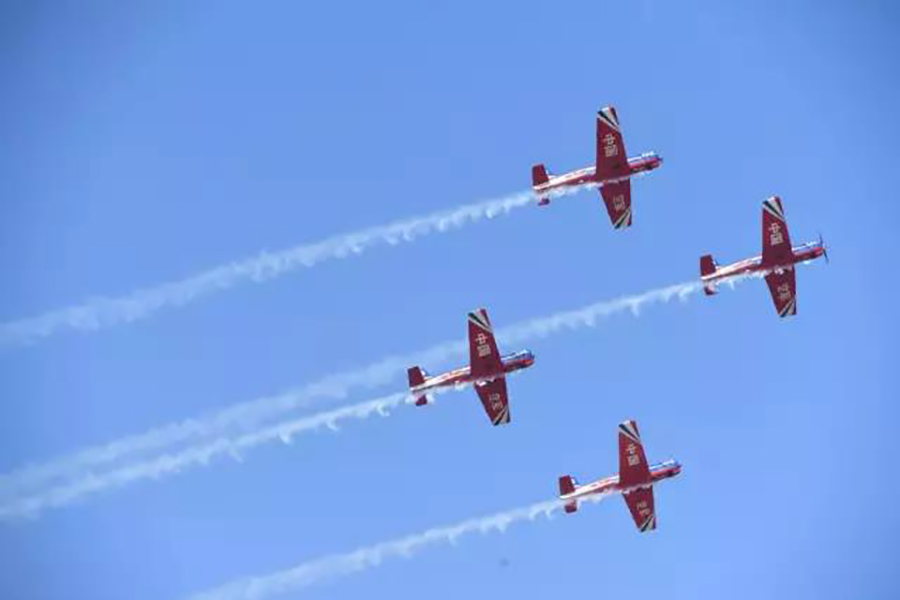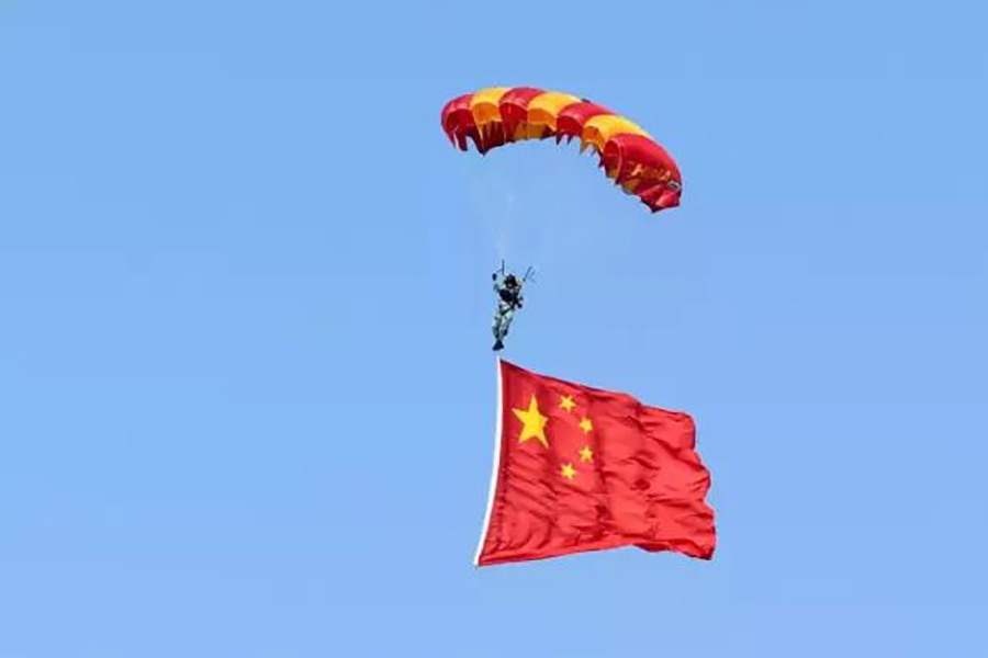 9时许,随着6枚信号弹腾空而起,运送跳伞表演队员的运-5飞机飞临现场,当降落伞如春蕾般迎风怒放、扮靓九天的时候,现场群情激动。在蓝天白云的衬托下,鲜艳的五星红旗、八一军旗、空军军旗迎风飘扬,“听党指挥”“能打胜仗”“作风优良”等横幅猎猎作响。“天之翼”飞行表演队表演、空降兵空中突击行动展示等飞行表演更是深深吸引着观众的眼球。