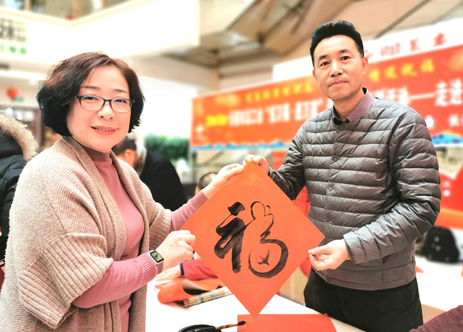 进入一楼大厅未见其人,就会闻到阵阵的墨香飘来,书画台上,笔墨纸砚一应俱全,书画家们神情专注,现场挥毫泼墨大到横竖撇捺,小到一个点都一丝不苟,起笔如行云流水,收笔如秋风落叶,一起一收间不同形态的“福”在书画家的笔下一气呵成。14名书画家书画作品风格迥异,行书、草书、隶书篆书、楷书各有擅长,大家可以根据自己的喜好向书画家们求取。
