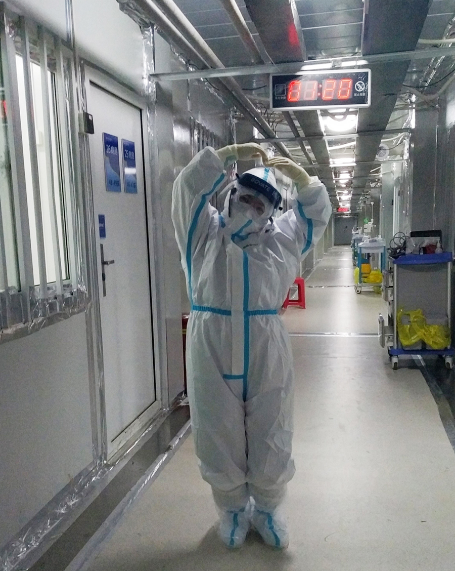 2月24日,我们疗区患者越来越多,工作已经步入正轨了。我似乎已经渐渐习惯这种生活,每天晚上走在长长的走廊上,从每个窗口检查病人的情况,只有自己的脚步声陪伴着我。凌晨2点,我在巡视病房的时候,忽然发现有一个病房开着灯,原来是一位患者阿姨在看电视。她在窗口看见了我,于是就冲我笑了一下,我也朝着她笑,然后忽然想起隔着防护设备她是看不见我的笑容的,于是就朝着阿姨摆了摆手。阿姨笑得更开心了,我已经很久没见过这么美丽的笑容。