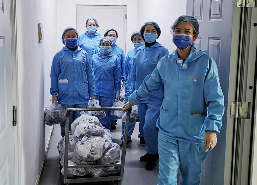 每当他们劳累一天脱下手套时,在滑湿粉和汗渍浸泡下的双手早已被泡得起皱、皲裂。为了不耽误工期,大家不敢多吃饭、多喝水、上厕所,在这种高强度工作下,有的人颈椎病犯了,有的人腰突老毛病复发了,但是没有一个人抱怨,所有人都在加班加点、任劳任怨、做着奉献,只希望尽自己的一份力量,让更多在抗疫一线的医护人员拥有健康的身体,让更多市民在他们的护佑下健康生活。