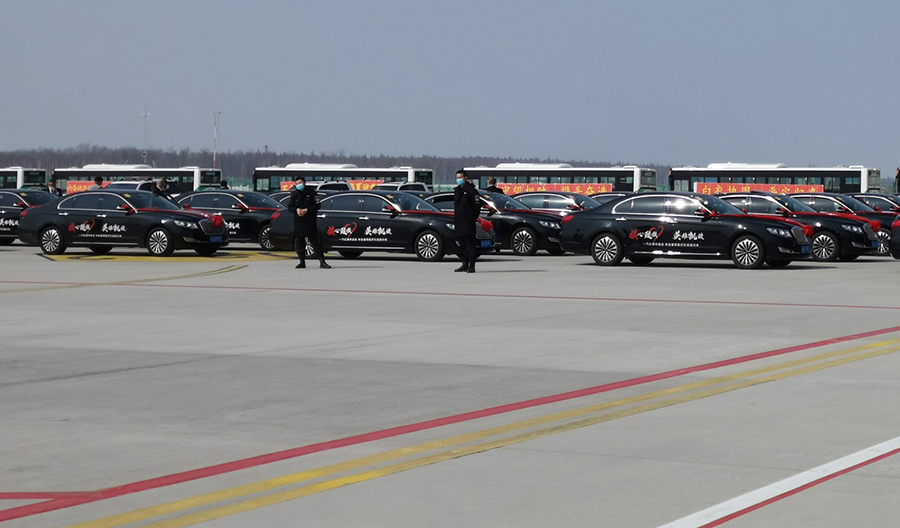 13时34分,搭载英雄的“胜利号”降落。过水门,为你们接风洗尘;献鲜花,送上家乡人民的敬意;走红毯,今日你们是最亮的星。家乡人民满含热情,迎接你们回家,辛苦了,英雄们,好好休息!