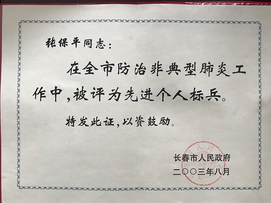 张保平主席身为共产党员,在关键时刻总是能挺身而出。2003年,他作为吉林省首批抗击非典工作者,带领医务人员奋战在最前线,一连十余天连续作战,被长春市政府授予“抗击非典优秀个人”称号。2020年,面对新冠肺炎疫情,他再挑重担,坚定地站在了防疫一线。