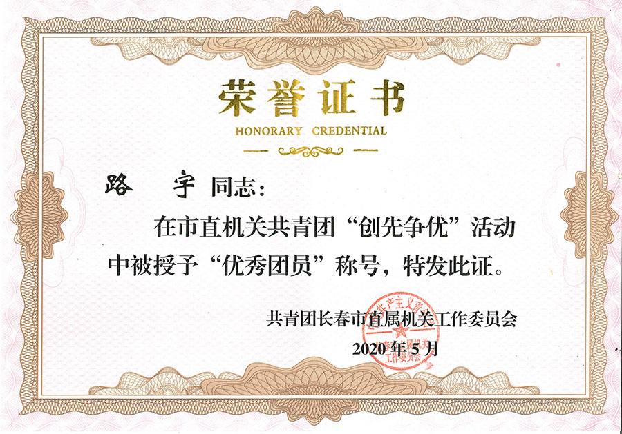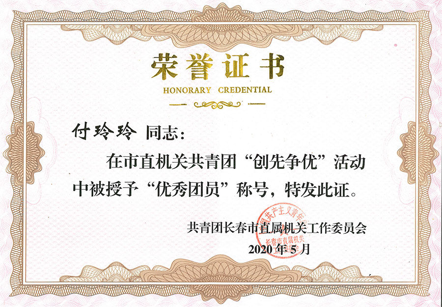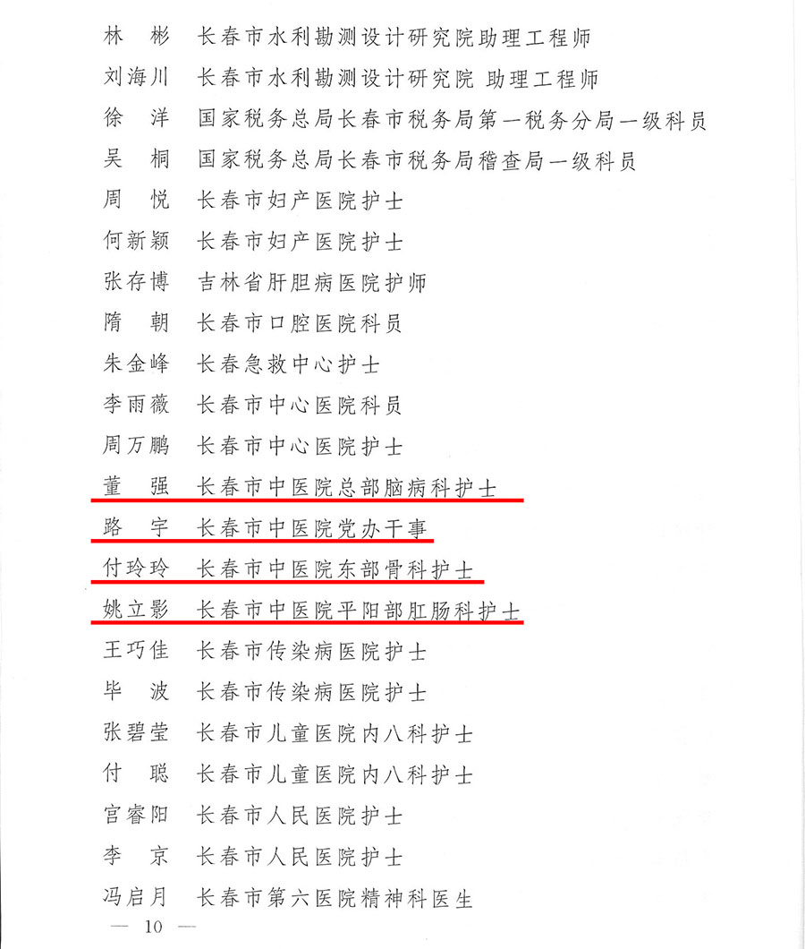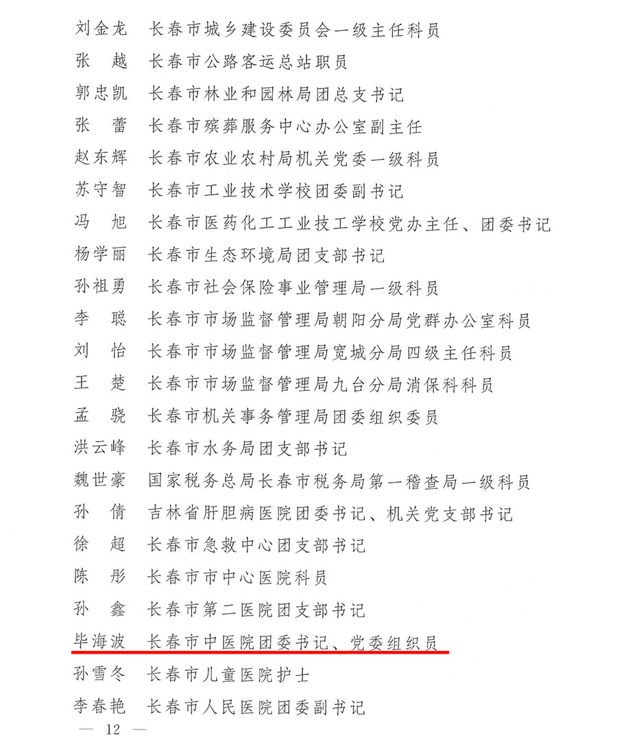 为表扬先进,树立典型,激励广大团员、团干部和各级团组织扎实工作,奋发有为,推动团的工作再上新台阶,共青团长春市直属机关工作委员会决定,对评出的先进团委、团总支、团支部和优秀团员、团干部给予表彰。医院东部团支部、总部内科团支部荣获先进团支部称号,医院团委书记、党委组织员毕海波荣获优秀团干部称号,董强、路宇、付玲玲、姚丽影荣获优秀团员称号。