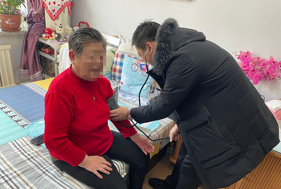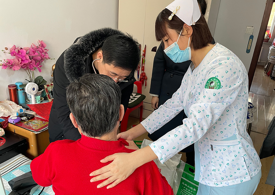 慰问组一行人带着米、面、油等生活必需品来到了宫大娘家,同时,还特意带去了春联和福字,对她及其家人致以春节的问候。宫大娘见到慰问组人员的到来满心欢喜,她激动地说:“我的父母去世早,我和兄妹5人是在党的关怀和培养下长大的。”宫大娘非常感恩党的福祉,现在她的四个儿女也都是共产党员。在交谈中慰问组人员不难发现,宫大娘是发自内心对党有着深厚的感情,那种对党的爱戴与尊敬让在场所有人都感动。慰问组人员得知宫大娘前不久摔伤过。这让原本就有高血压、肺气肿和心脏病的她病情更加严重,稍有活动,就喘促不已,每月医药费就要两千多。跟随慰问的总部老年病科主治医师陈金东现场为她测量血压、听心率、把脉、开中药,并嘱咐她日常口服用药的一些注意事项。宫大娘认真地听着,不停地询问自己的病情,并希望自己的身体快点好起来,表示还要继续为党和社区做贡献。