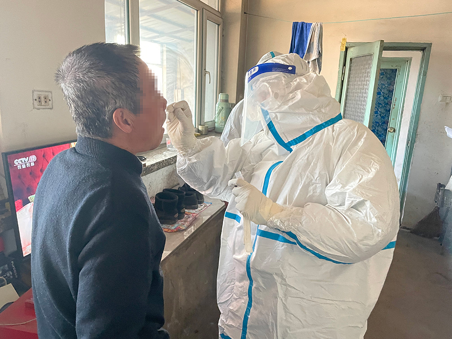 东北的三月,乍暖还寒,室外温度常常还是零下十几度,天公不作美,此次核酸检测任务又碰上了漫天飞雪。而救援队绝大多数的采集点都在室外。工作不久,很多队员的手就会被冻得又红又肿。尽管有的队员提前准备了,但长时间的户外工作,还是被冻得“透心凉”。在一些乡村,由于村民居住比较分散,无法设立固定的核酸采集点,队员们就要蹭上村民的三轮车、摩托车,而更多的则是穿着厚厚的防护服徒步入户。脚下是厚厚的积雪,面罩满是哈气,每一步都很坚信,每一步却又很坚定。在大家心里,核酸采样犹如排雷,容不得出错。