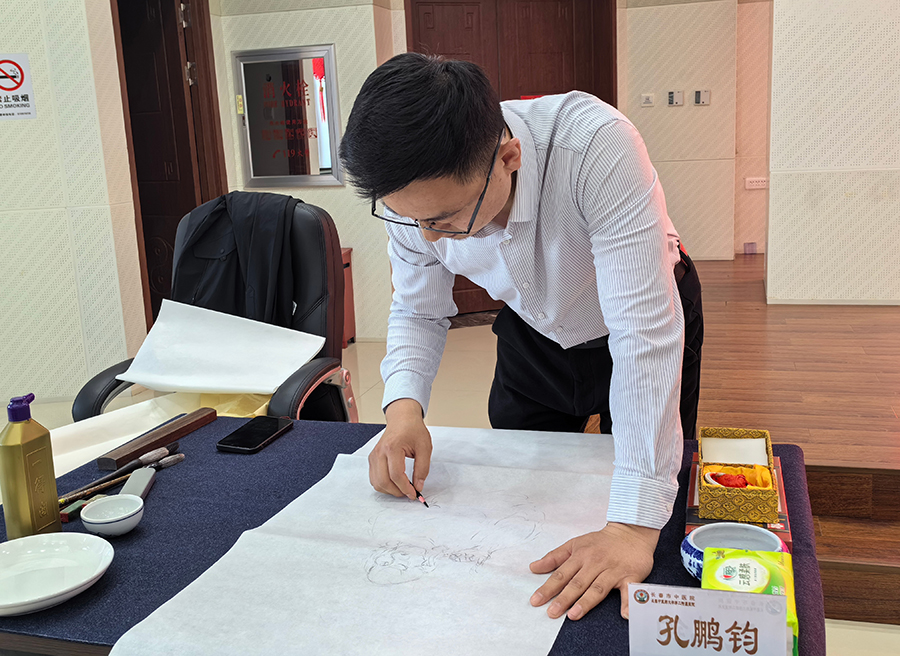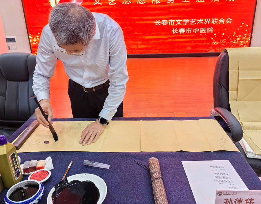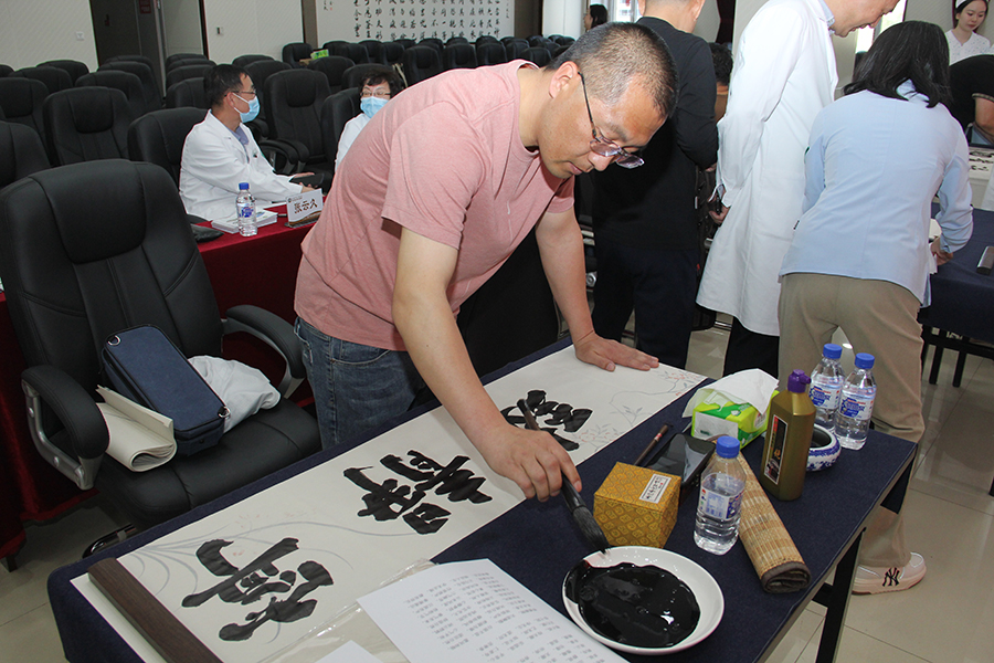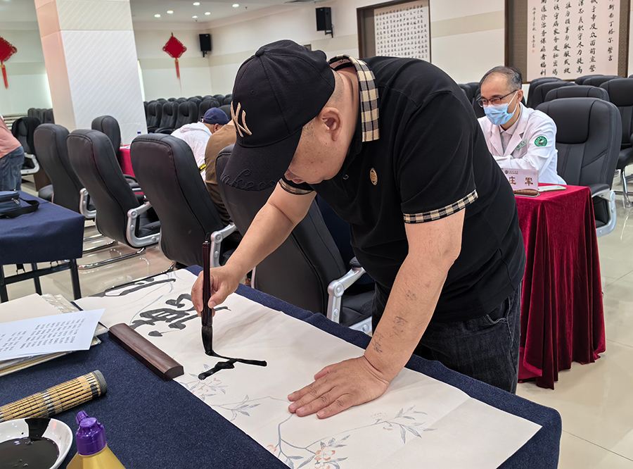 另一边,书画艺术家们正全神贯注地投入到创作中。他们或立或坐,或沉思或挥笔,在宣纸上用细腻的笔触映照出脑中灵感的火花,用书画作品描绘出杏林的生机与活力,将艺术的魅力与医务工作者的辛勤工作完美融合。随后,艺术家们亲手将作品赠予医护人员,传递着敬意与感激。艺术家们创作的书法、绘画作品,不仅是对市中医院全体人员辛勤工作的认可与鼓励,更是为医院70周年庆增添了浓厚的文化底蕴和艺术气息。这些作品将激励医护人员继续担当奉献,守护百姓健康,书写新时代医者荣光。