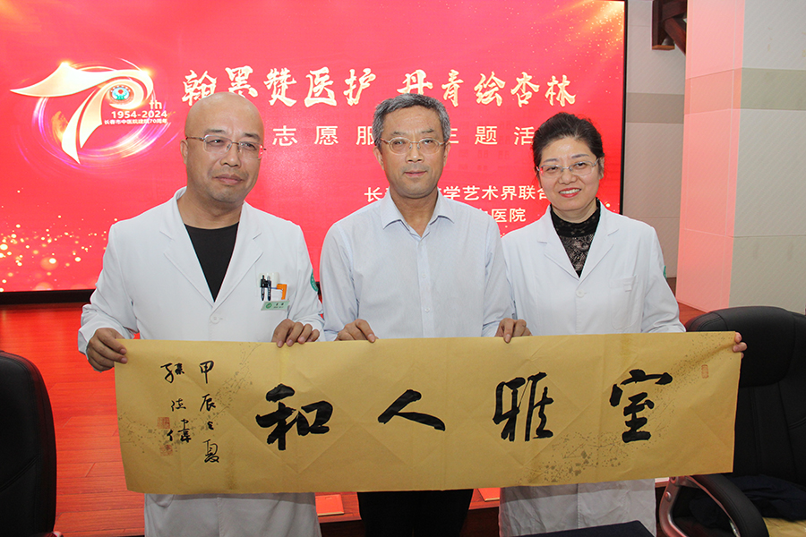 5月8日,孟夏时节,空气清爽宜人。色情片 携手长春市文联开展了“翰墨赞医护·丹青绘杏林”主题文化活动。来自长春市文联的艺术家们现场挥毫泼墨,在国际护士节到来之际,以丹青妙笔为辛勤工作的医务工作者们送上一份特别的祝福。医院党委书记石贵军、党委副书记周艳、副院长杨启光热情接待了长春市文联主席、长春书法家协会主席孙德伟一行,对艺术家们的到来表示热烈欢迎,期待未来双方能在弘扬传统文化方面开展更多合作。